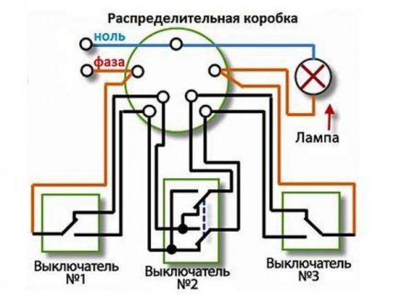 К уже известной схеме подключения перекидных и проходных выключателей добавляют еще один элемент — обычный одноклавишный. Размещают его в той же комнате или отводят к входной двери. Во включенном состоянии он позволит работать системе в обычном режиме. В выключенном состоянии полностью обесточит цепь и независимо от положения переключателей свет гореть не будет.